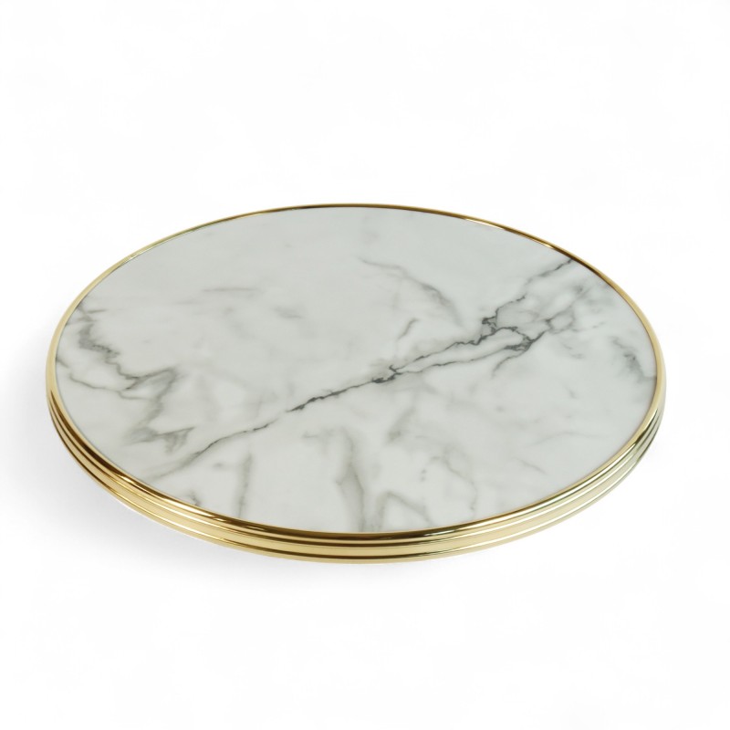 Le plateau de table carré en stratifié imitation marbre blanc CALACATTA - cadre laiton mouluré est adapté pour un usage aussi bien extérieur qu'intérieur pour les professionnels de la restauration. Esthétique, design et robuste, il se combine parfaitement aux pieds en fonte présents dans notre gamme.