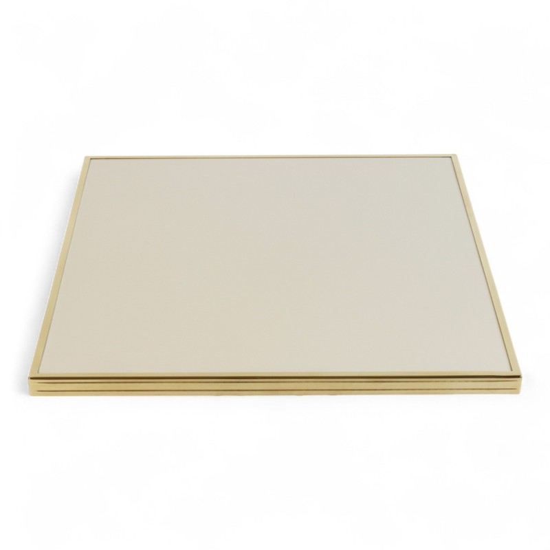 Ce plateau de table carré en stratifié crème - cadre laiton mouluré est adapté pour un usage aussi bien extérieur qu'intérieur pour les professionnels de la restauration. Tous nos plateaux de table VENDÔME sont fabriqués en Belgique et cerclés de façon artisanale en Région Parisienne. Cette gamme de plateaux de table bistrot se décline à l'infini, selon vos envies et les finitions choisies.