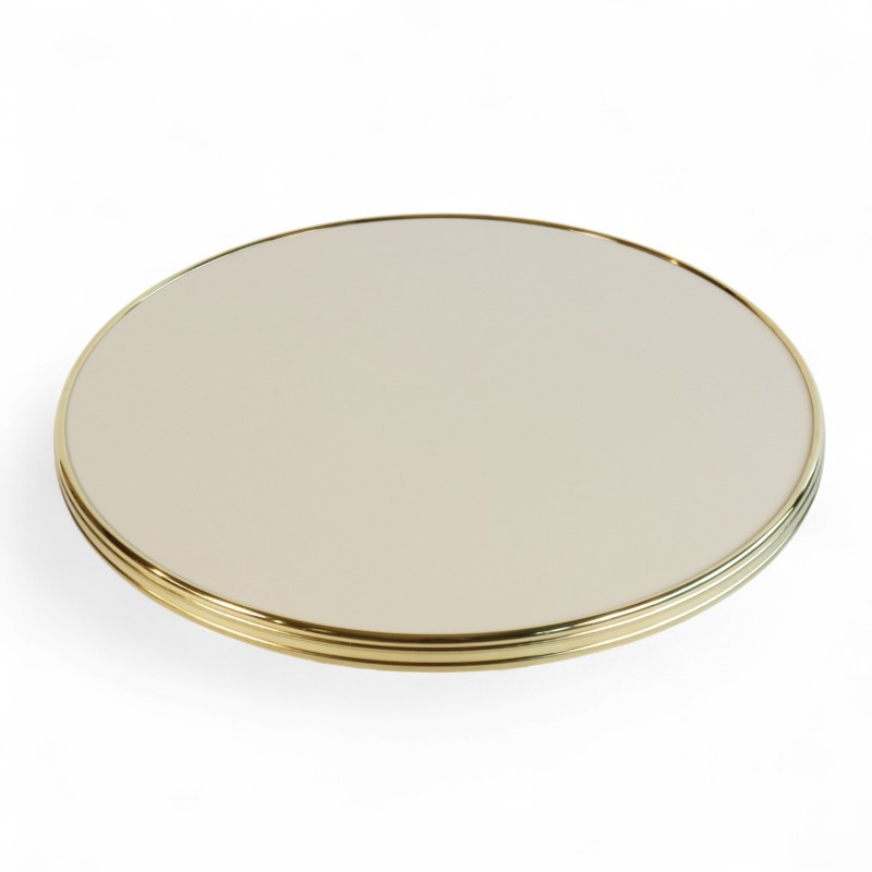 Ce plateau de table rond en stratifié couleur crème finition brillante - cerclage laiton mouluré - est adapté pour un usage aussi bien extérieur qu'intérieur pour les professionnels de la restauration. Tous nos plateaux de table VENDÔME sont fabriqués en Belgique et cerclés de façon artisanale en Région Parisienne. Cette gamme de plateaux de table bistrot se décline à l'infini, selon vos envies et les finitions choisies.